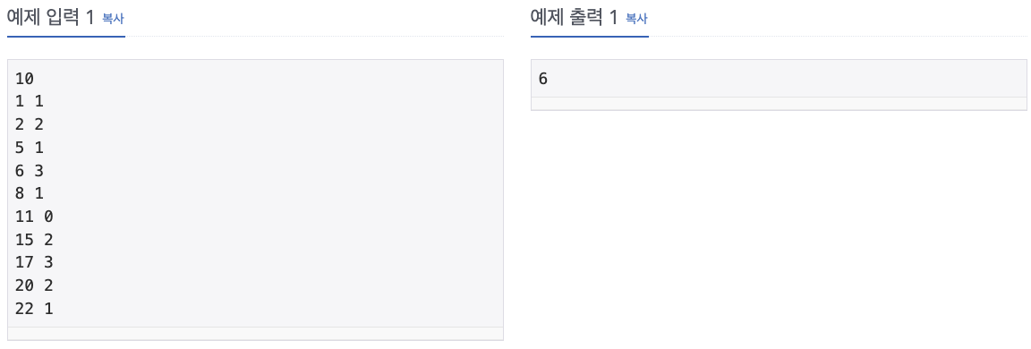 첫째 줄에 n이 주어진다. (1 ≤ n ≤ 50,000) 다음 n개의 줄에는 왼쪽부터 스카이라인을 보아 갈 때 스카이라인의 고도가 바뀌는 지점의 좌표 x와 y가 주어진다. (1 ≤ x ≤ 1,000,000. 0 ≤ y ≤ 500,000) 첫 번째 지점의 x좌표는 항상 1이다.