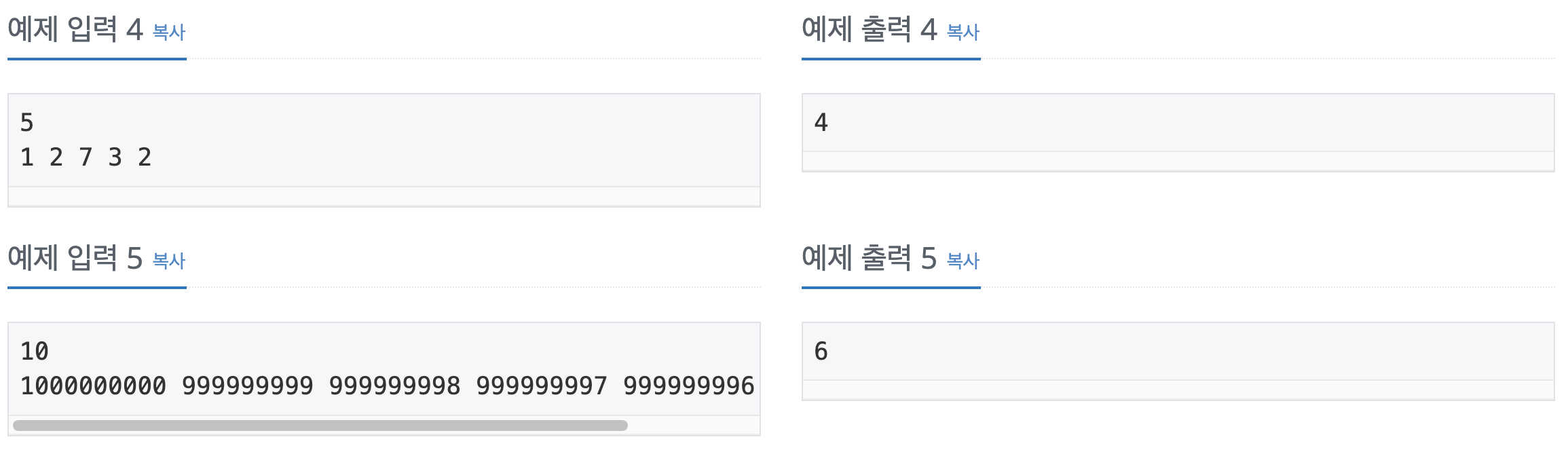 첫째 줄에 빌딩의 수 N이 주어진다. N은 50보다 작거나 같은 자연수이다. 둘째 줄에 1번 빌딩부터 그 높이가 주어진다. 높이는 1,000,000,000보다 작거나 같은 자연수이다.