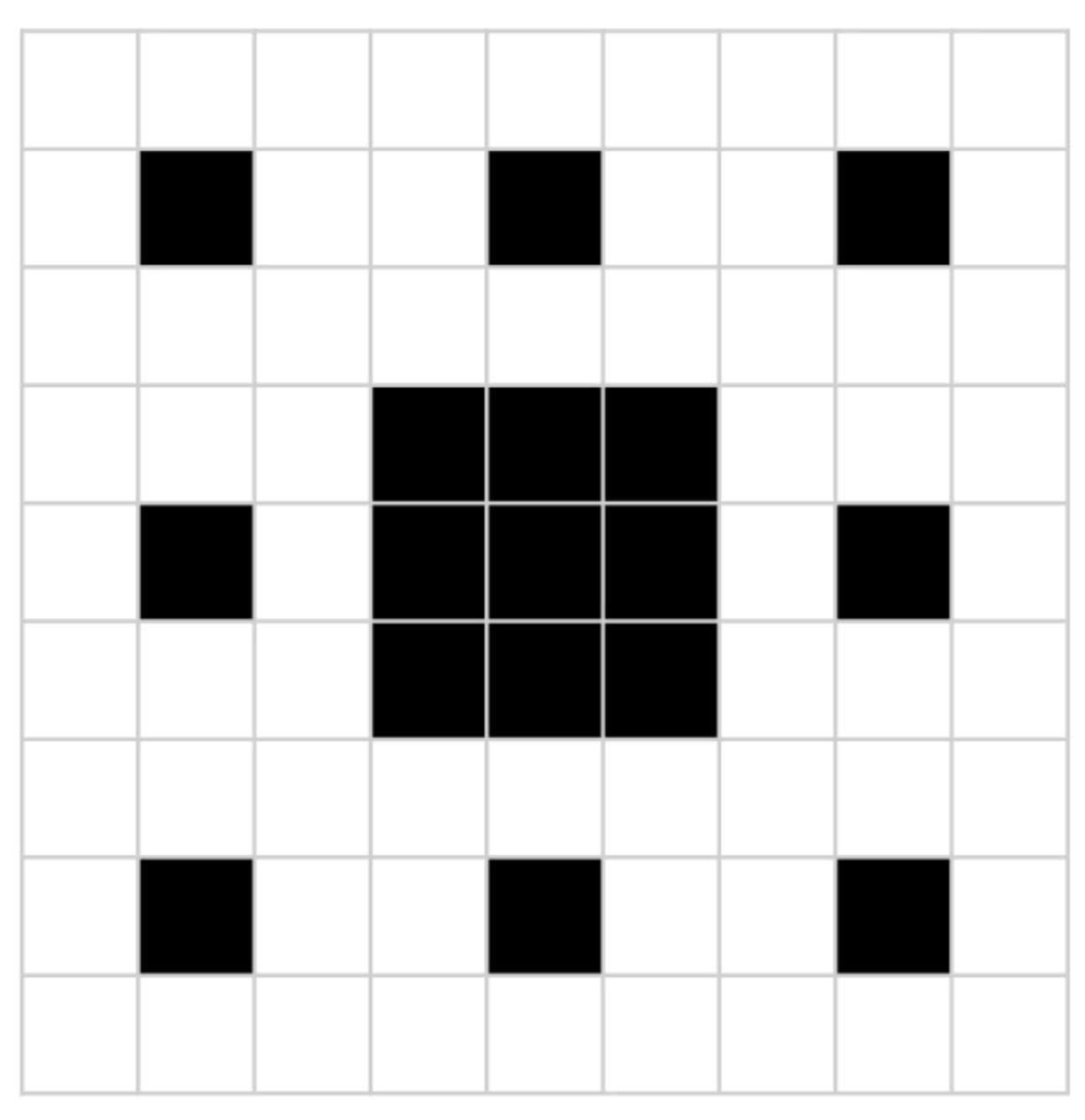 예를 들어, N=3, K=1이라면, 시간 1에 3×3 정사각형이 된다. 가운데 정사각형은 검정색이고, 나머지는 흰색이 된다. 시간 2때 9×9 정사각형이 되고, 17개는 검정이고, 나머지는 흰색이다.