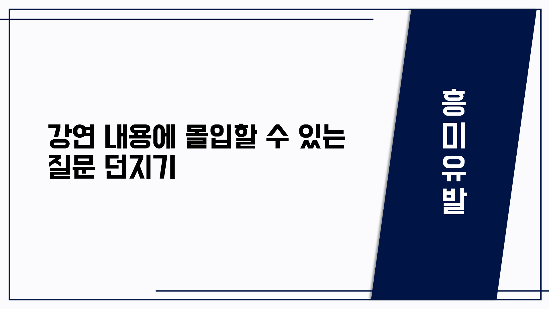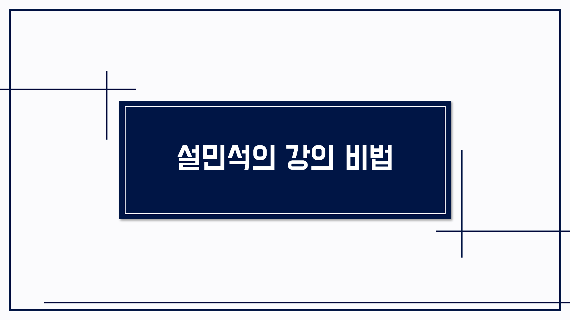 또, 설민석 강사님은 듣는 사람이 집중력을 잃지 않게끔 중간중간 내용에 몰입할 수 있는 질문을 던집니다. 무언가 대답을 요구하는 질문이 아니라, 듣는 사람이 직접 생각해볼 수 있게끔 유도해주는 질문을 합니다. 말로만 해서는 와 닿지 않을 것 같아서 이 부분도 영상을 통해 자세히 알려드리겠습니다. 1:52~2:39 여기서 ’그런데 전쟁이라는 게 하고 싶다고 하는 겁니까?‘라는 말에 고개를 젓거나 ’명분이 있어야 되지 않습니까?‘라는 말에 고개를 끄덕이지는 않았나요? 설민석 강사님은 이런 질문으로 강연에 참여를 이끌고 흥미를 유발해줍니다. 중간중간 집중이 흐려질 수 있는 것을 막으면서 동시에 다음 내용으로의 진행도 매끄럽게 이어지는 것입니다.우리가 발표를 하는 목적, 이유는 무엇일까요?(질문...답...)아마 주로 정보 전달이나 어떠한 주제를 알리기 위함이 목적일 것입니다. 그렇기 때문에 정보 전달 위주의 내용으로 구성되는 경우가 많습니다.하지만 설민석 강사님의 특징을 키워드로 정리해보면 정보전달을 목적으로 한다는 생각이 잘 들지 않습니다. 실제로 강의를 볼 때도 어떤 내용을 전달하거나 알리겠다는 느낌보다는 한 편의 이야기를 들려준다는 느낌을 더 많이 받았습니다.설민석 강사님의 강의를 한마디로 요약해보자면 ’발표를 통해 이야기를 들려주자‘라고 할 수 있을 것 같습니다. 발성, 연기, 질문을 적절히 이용해서 이야기를 들려준다면 청중의 흥미를 끌면서 내용 전달도 잘 되는 발표가 될 수 있을 것입니다.감사합니다.