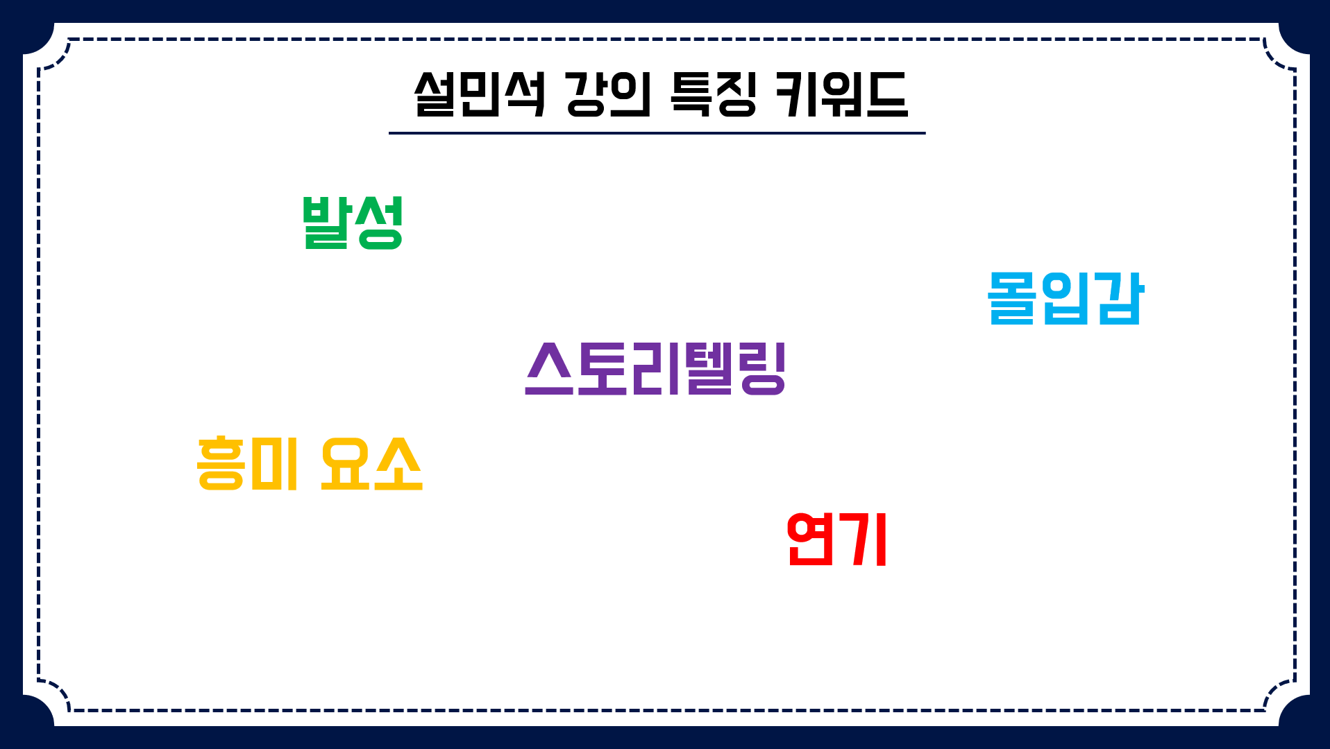 저는 설민석 강사님의 강의를 분석하여 장점을 소개하려고 합니다. 설민석 강사님의 강의는 한국사 인강, 예능 프로그램, 강연 등 다양한 곳에서 접할 수 있기 때문에 다들 한 번씩은 설민석 강사님의 강의를 들어보셨을 거라고 생각합니다.설민석 강사님이 ’연극영화과‘ 출신이라는 사실, 알고 계셨나요? 그래서인지 강의에서 연기를 하는 것처럼 실감나고, 발성도 돋보입니다. 여기서 제가 말하는 연기는 대사를 하는 것이 아니라 하고자 하는 말, 강연 속의 이야기를 실감나게 전달하는 것입니다. 이렇게 설명하면 잘 안 와 닿을 것 같으니까 영상을 통해서 설명하겠습니다.1:06~1:37 소리 없이 자막으로 한 번 보고, 소리 켜고 들어서 비교하기 그냥 정말 국어책 읽듯이, 무미건조하게 ’고구려의 상황이 어땠는지 살펴보겠습니다. ~ ‘라고 하는 것보다 저 흥미진진하게 들리지 않나요? 이렇게 발표 내용에 맞게 높낮이나 강세를 주면 더욱 재미있고 몰입감을 높여줍니다.