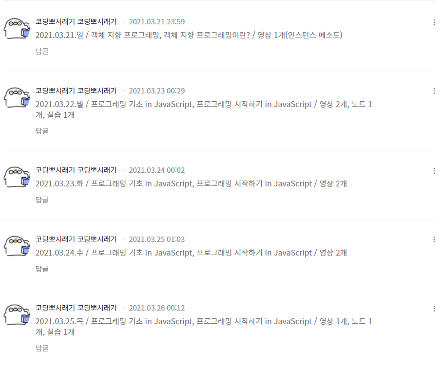 | [코드잇 출석] 매일매일 수강하고 댓글 남기기 (10) | 2021.03.21 |