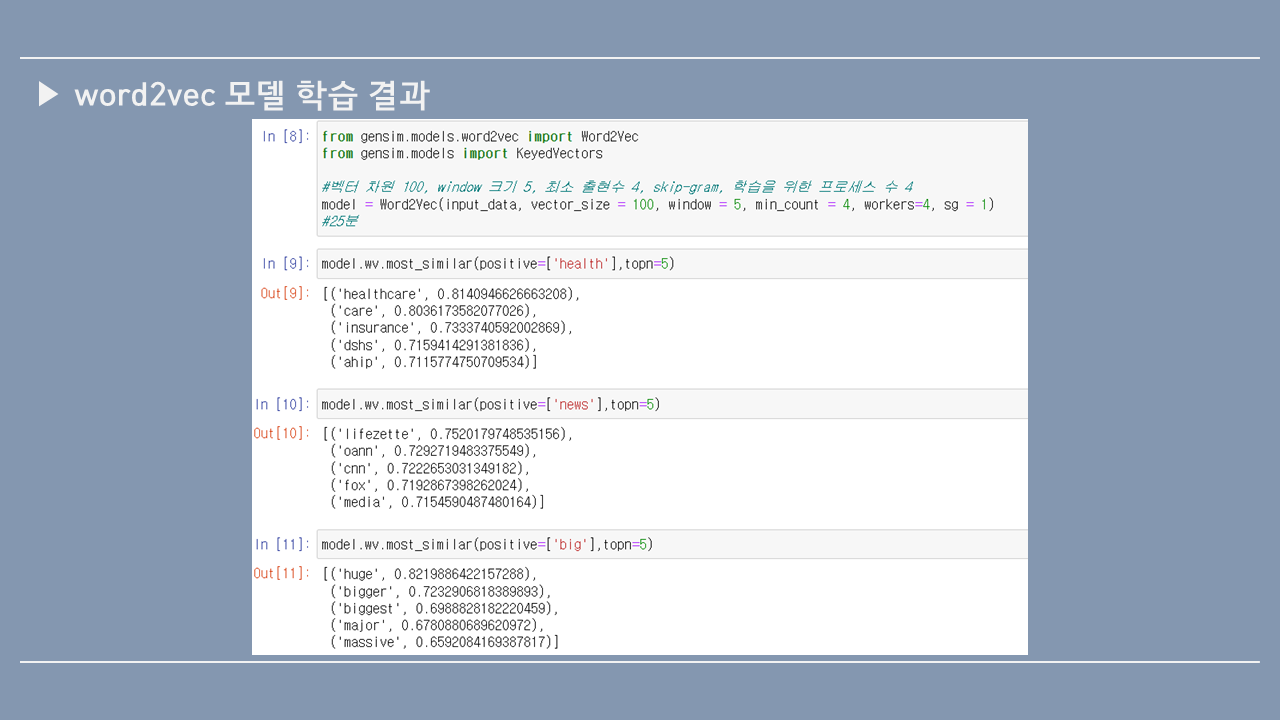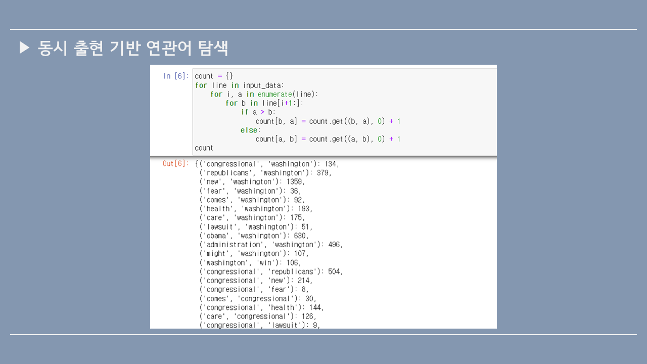 유의어가 아니라 연관어를 얻기 위해 동시 출현 기반 방법을 이용해보았다. 둘의 비교가 필요할 것 같다.