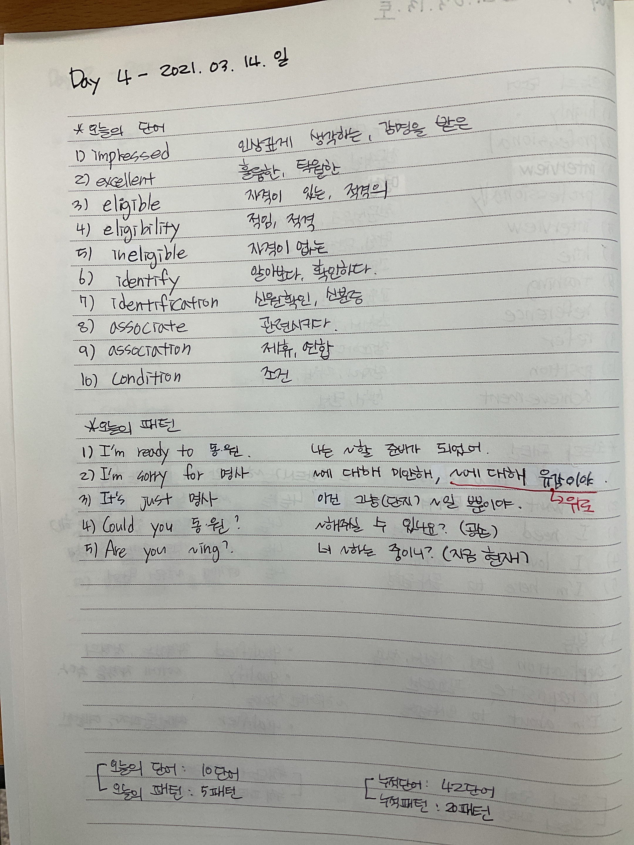[영어 스터디] 4일차 - 2021.03.14.일 (단어: 10/42 + 패턴: 5/20)